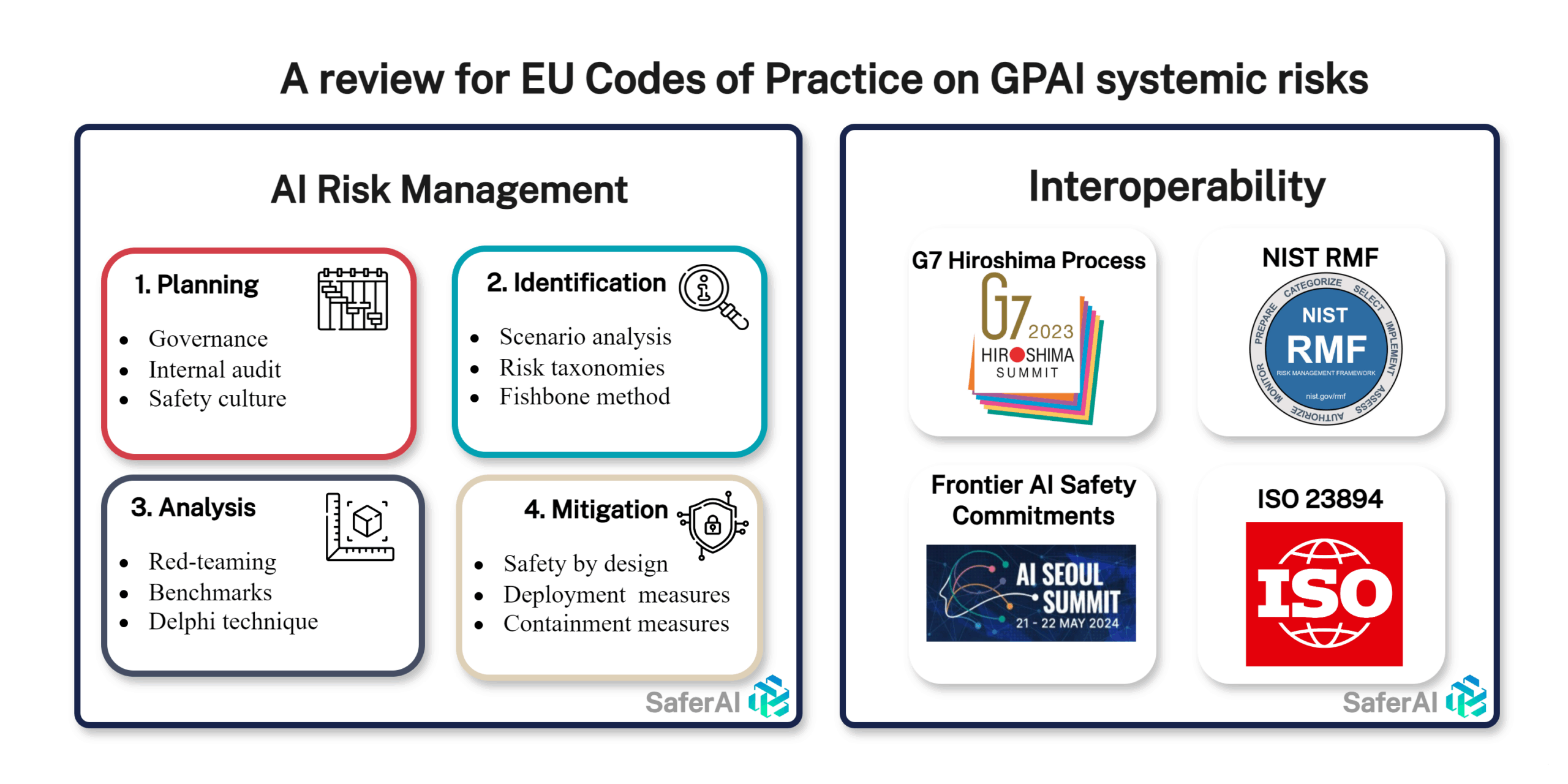 Finally, the NIST AI Risk Management Framework is a high-level framework for the risk management of AI systems. Although its content is similar to what has been discussed above, it uses a different backbone structure centered around four key steps: “Govern”, “Map”, “Measure” and “Manage”. We recommend at the end of the EU Codes of Practice effort to create a table of interoperability as done in Barrett et al. (2023), to show how the Codes maps to the NIST framework. However, we recommend against directly using this framework for the Codes of Practice itself, due to its lesser interoperability than the ISO 23894 one discussed above. Based on this NIST framework, the UC Berkeley Center for Long-Term Cybersecurity (CLTC) has produced an extensive risk management framework for advanced GPAI systems. This work can serve as a valuable resource for the GPAI Codes of Practice, particularly in the areas of evaluations and addressing risks that are currently difficult to measure precisely.