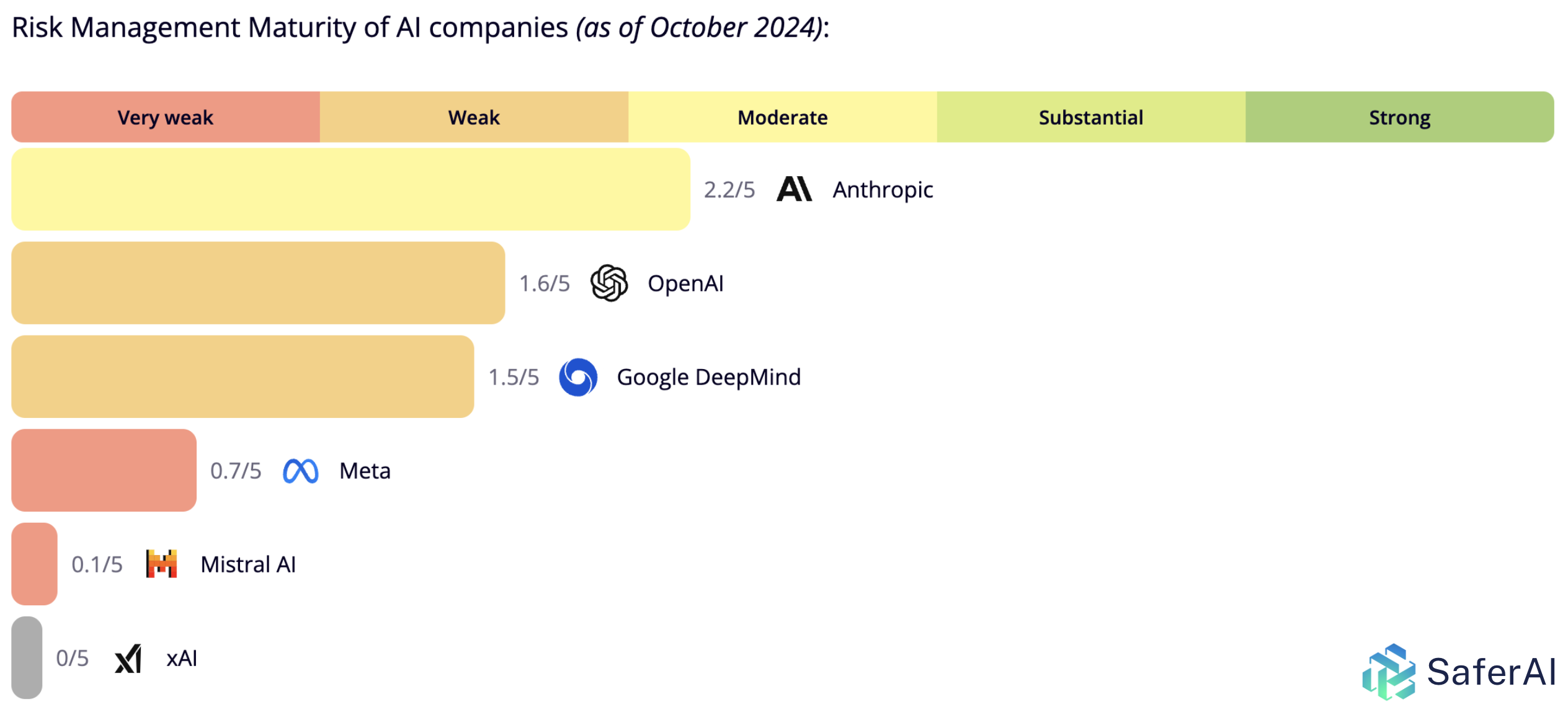 • The report ranks companies on a 0-5 scale. Meta, Mistral AI and xAI lag behind at 0.7, 0.1 and 0, i.e. “Very Weak”, indicating an absence of effort to do serious risk management.