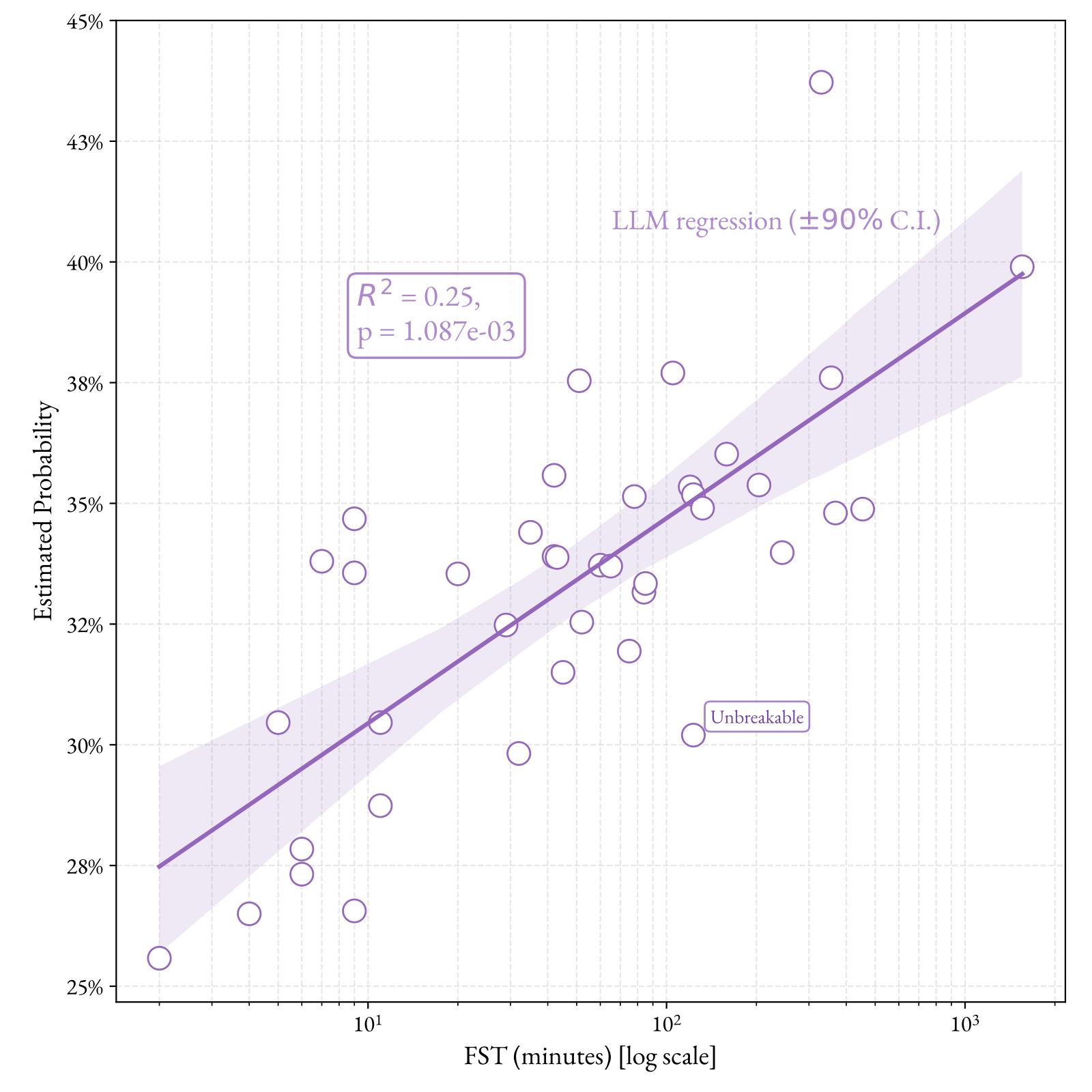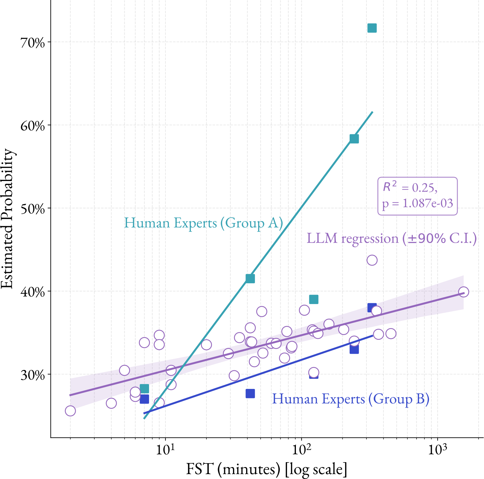 We note a moderate positive correlation (R2= 0.25, p = 1.087·10-3) between increasing FST and increasing estimated likelihood of success, despite the LLM estimator not having access to information on other tasks when making the prediction. This suggests that the estimator captures an actual relationship between the complexity of the task and the uplift that such an AI might provide.
