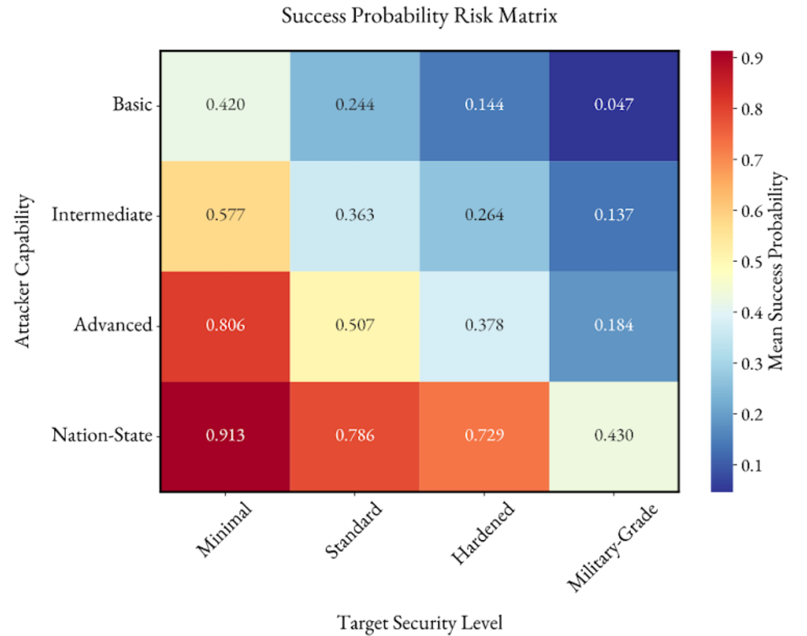 The results show clear relationships between both variables and attack success rates (Figure 3). For example, we can analyze how attacker capability affects success probability when targeting an S&P 500 organization with Standard security. Success rates rise sharply from 24% for Basic attackers to 79% for Nation-State capabilities. Similarly, for Advanced attackers targeting varying security levels, success rates drop from 81% against Minimal defenses to under 20% against Military-Grade defenses. Overall, the heatmap reveals high-risk combinations (Nation-State vs Minimal defenses, >90% success) and low-risk combinations (Basic attackers vs Military defenses, <10% success). Between these extremes, several intermediate-risk zones emerge where moderate attackers face standard or hardened defenses.