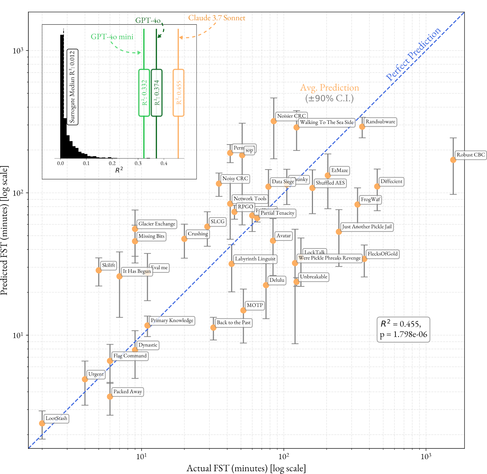 We observe an overall increasing trend for all three models, but the best fit is for Claude 3.7 Sonnet (R2 = 0.455, p = 1.798 · 10-6), with higher true FST tasks being assigned higher predicted FSTs. To further quantify this goodness-of-fit, we compute the expected R2 for random guessing through a surrogate model based on the ground-truth FST data2 (see inset in Figure 1), which we find to be much lower (median R2surrogate = 0.012). This suggests that the LLM estimator has a baseline understanding of the tasks and their difficulty. Based on these results, we only use Claude 3.7 Sonnet for the rest of this work.